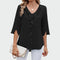 Elegancka czarna bluzka z romantycznymi falbanami, które dodają ruchu i kobiecości. Dekolt w kształcie litery V z dyskretnymi falbanami z przodu podkreśla styl, podczas gdy rękawy 3/4 z rozcięciem po bokach nadają nowoczesny akcent. Idealna na wieczorne wyjścia, ale także na szykowne wystąpienia w biurze, łatwo łączy się z spodniami lub spódnicą dla uzyskania efektownego rezultatu.