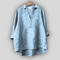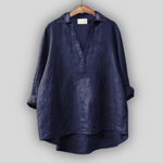 Elegancka lniana bluzka w kolorze białym, która emanuje świeżością i ponadczasowym stylem. Posiada dekolt V z dyskretnym zapięciem, długie rękawy, które można podwinąć, oraz asymetryczny dół z dłuższym tyłem, zapewniający komfort i swobodę ruchów. Idealny wybór do stylowych letnich kombinacji lub eleganckiego codziennego wyglądu.