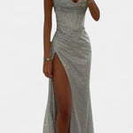 Odważna, dramatyczna i elegancka, sukienka Ines to element zaprojektowany, aby błyszczeć na każdej specjalnej okazji. Jej wąski krój syreny, koronkowa górna część i wysoki rozcięcie na udzie tworzą imponujący wygląd, który podkreśla wyrafinowanie. Ramiączka spaghetti i błyszczące wykończenie dopełniają nowoczesną i glamour estetykę.