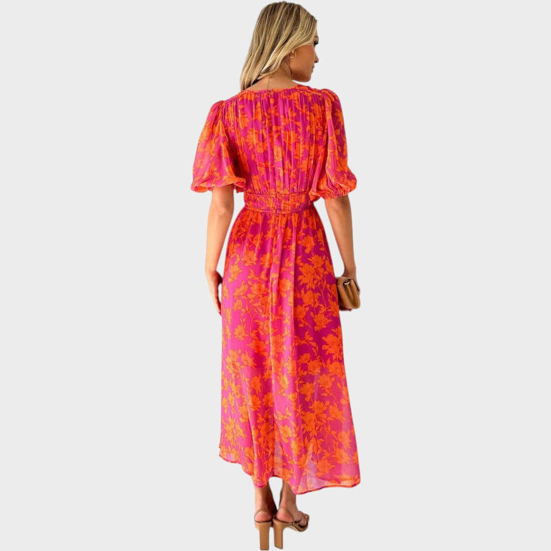 Ranka - Kolorowa midi sukienka z puffowymi rękawami i dekoltem w kształcie V