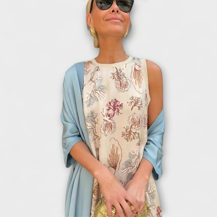 Ta maxi sukienka zachwyca subtelną elegancją i wyjątkową lekkością. Zwiewny fason pięknie układa się na sylwetce, tworząc harmonijną, kobiecą linię bez uczucia ciężkości. Delikatny wzór dodaje klasy i romantycznego charakteru, a dołączona lekka narzutka (kamizelka) sprawia, że stylizacja wygląda spójnie i dopracowanie bez dodatkowego wysiłku.