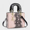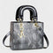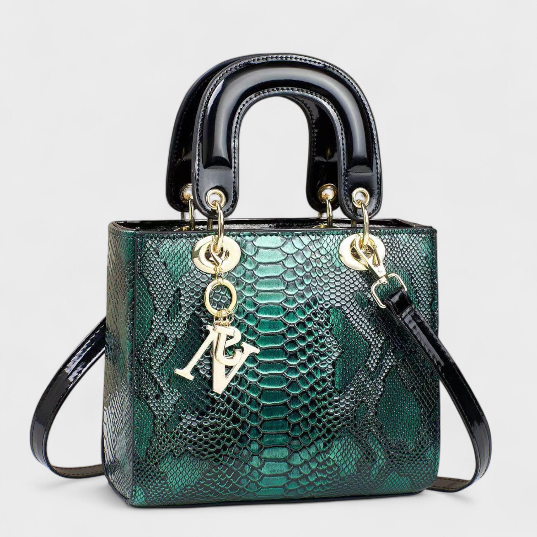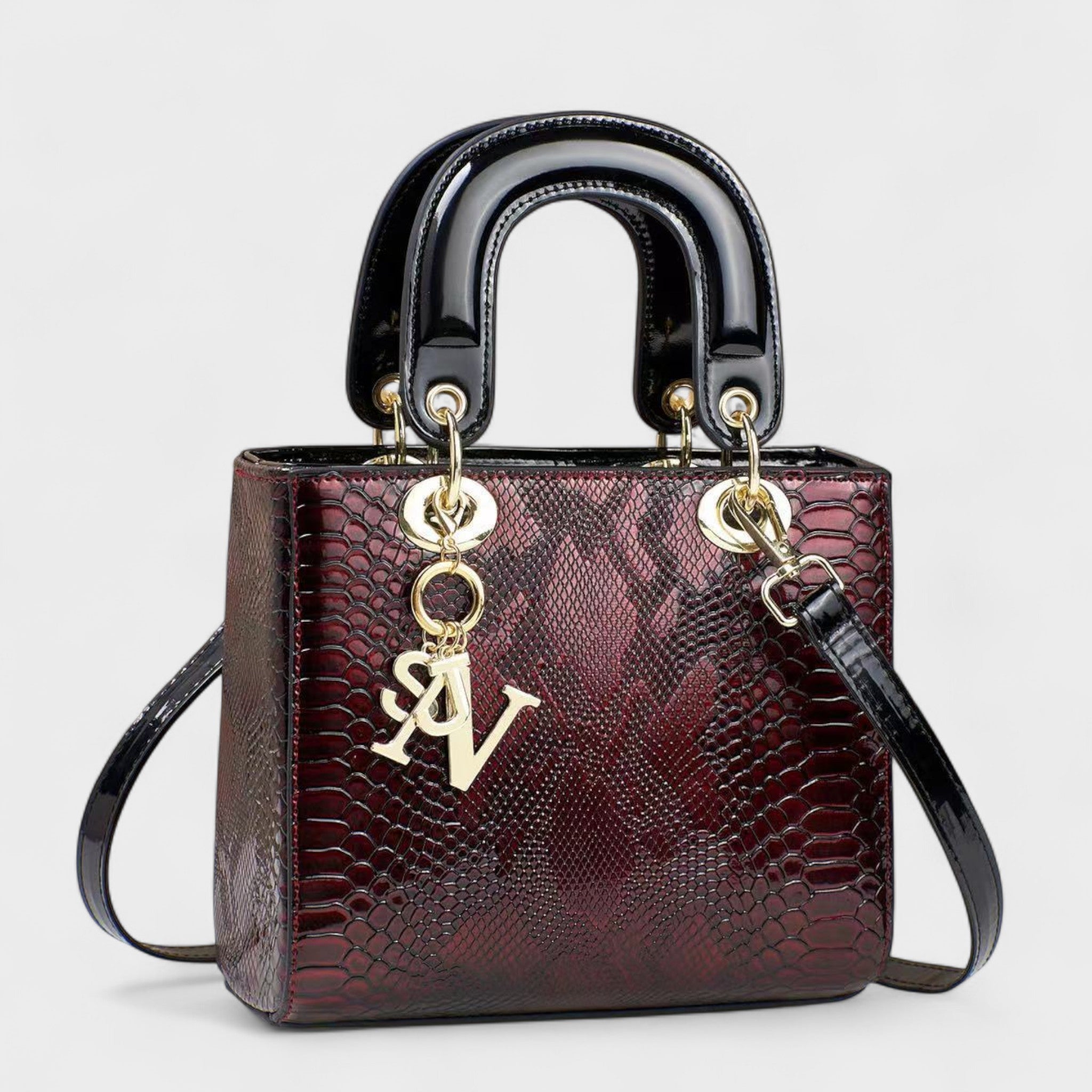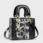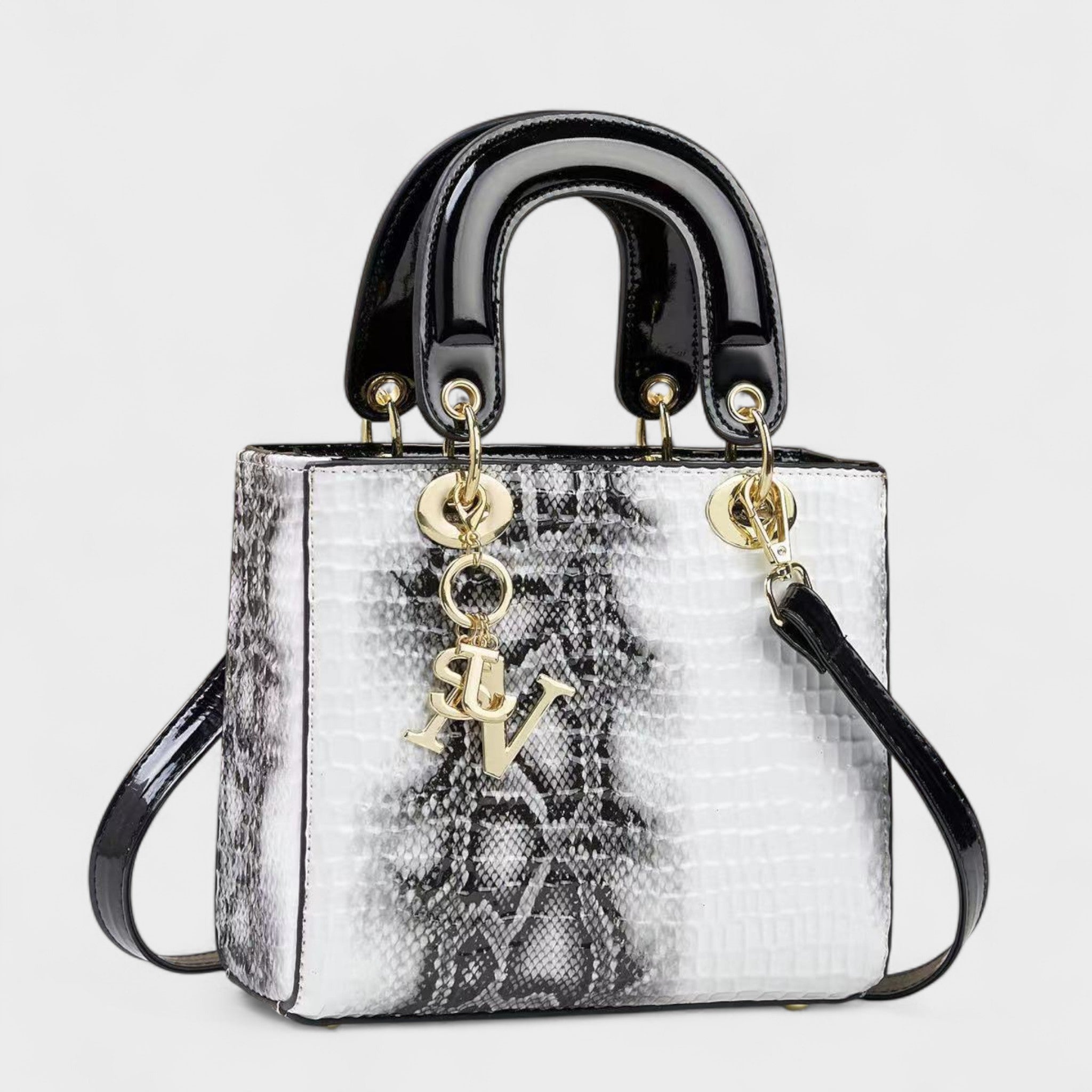 Złożone wykończenie w zwierzęcej teksturze i metalowe elementy o wysokim połysku sprawiają, że ta torba jest definicją wyrafinowania. Ustrukturyzowana, z podwójnymi uchwytami i długim, odpinanym paskiem, oferuje wszechstronność, która pasuje do formalnych wydarzeń oraz nieformalnych chwil ze stylem. Akcesorium, które natychmiast podnosi każdą stylizację, emanując wdziękiem i autorytetem.